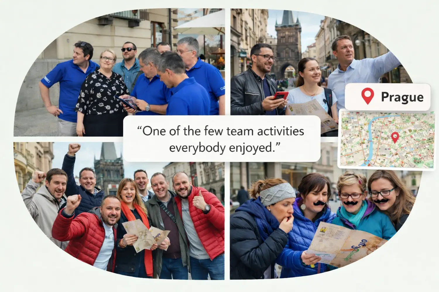 Our city-based team experiances turn Prague into a shared mission, where small teams of 4–6 solve challenges, collect points, and discover the city together at their own pace. No one is left standing on the sidelines, and no one is forced into the spotlight. Everyone contributes, everyone stays involved, and by the end, everyone leaves with a story to share. And because the entire experience is guided by a dedicated event manager, the fun also feels smooth, structured, and safe from start to finish.
